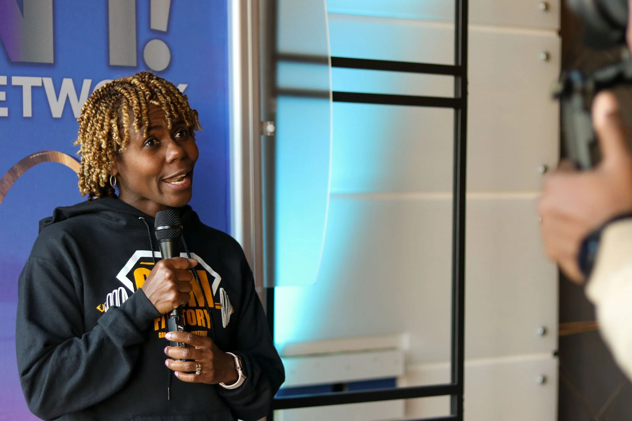 A woman with long curly hair holding a microphone and speaking on stage with purple and gray abstract patterned background.